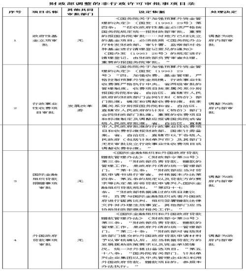 根据《国务院关于取消非行政许可审批事项的决定》(国发〔2015〕27号),决定将财政部4项非行政许可审批事项调整为政府内部审批事项。涉及政府性基金立项审批、行政事业性收费项目审批、国际金融组织贷款捐赠事项审批、外国政府贷款事项审批等。具体内容如下: